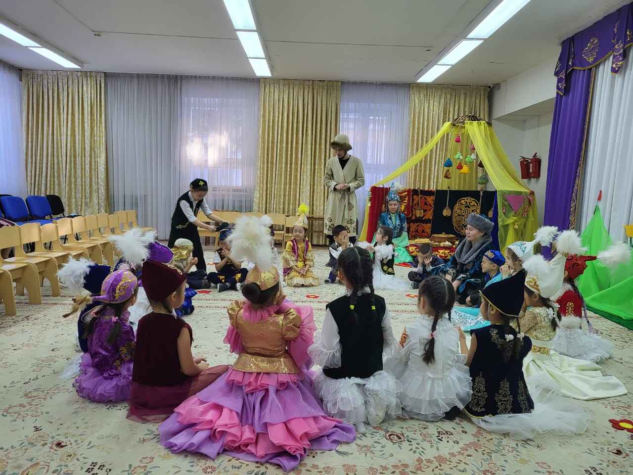 Наурыз аруы:Бүгінгі ұлыстың ұлы күнінде тәттіден шашу шашамын балалар! (балаларға шашу шашады)