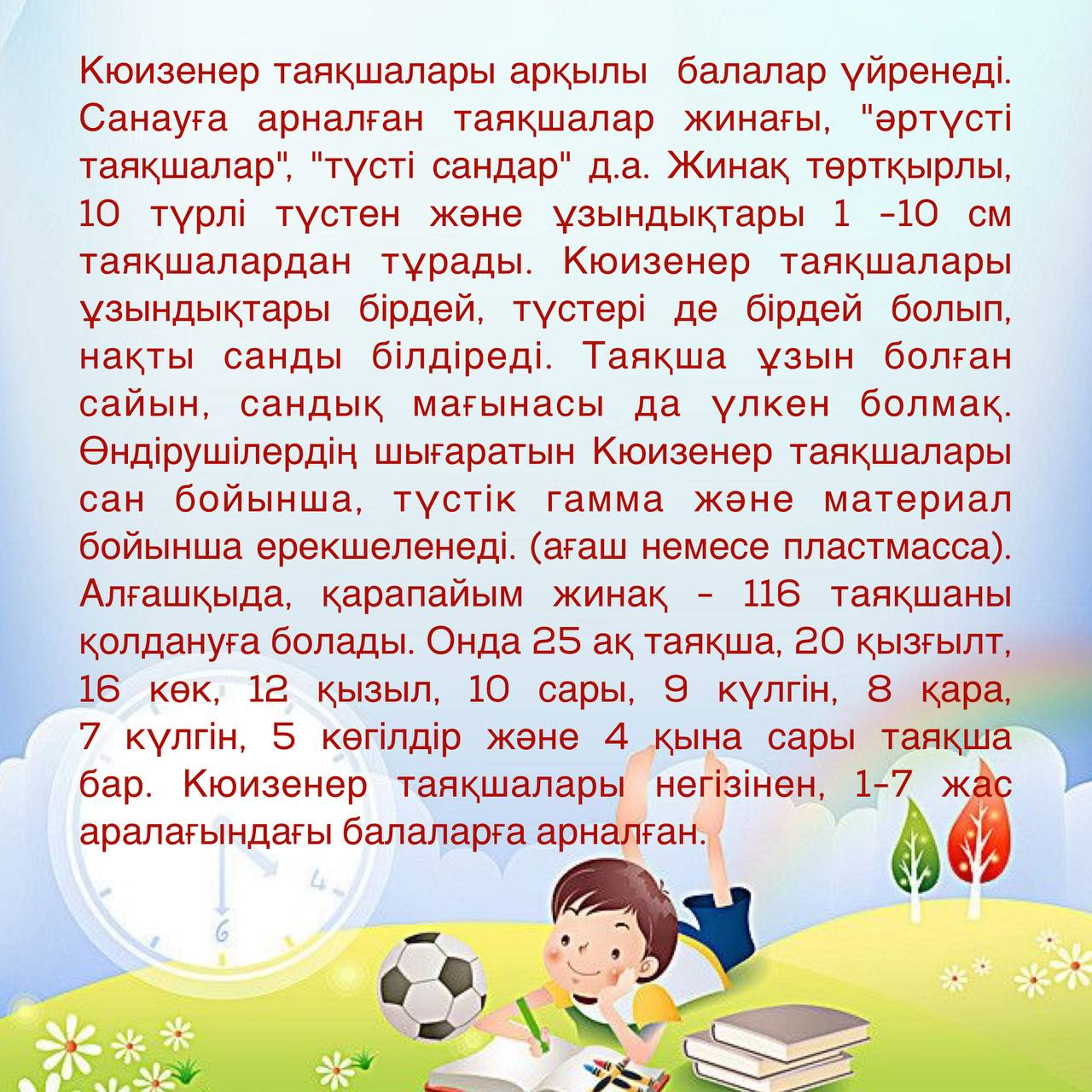 Кюизенер таяқшалары арқылы балалар үйренеді. Санауға арналған таяқшалар жинағы, "әртүсті таяқшалар", "түсті сандар" д.а. Жинақ төртқырлы, 10 түрлі түстен және ұзындықтары 1 -10 см таяқшалардан тұрады. Кюизенер таяқшалары ұзындықтары бірдей, түстері де бірдей болып, нақты санды білдіреді. Таяқша ұзын болған сайын, сандық мағынасы да үлкен болмақ. Өндірушілердің шығаратын Кюизенер таяқшалары сан бойынша, түстік гамма және материал бойынша ерекшеленеді. (ағаш немесе пластмасса). Алғашқыда, қарапайым жинақ - 116 таяқшаны қолдануға болады. Онда 25 ақ таяқша, 20 қызғылт, 16 көк, 12 қызыл, 10 сары, 9 күлгін, 8 қара, 7 күлгін, 5 көгілдір және 4 қына сары таяқша бар. Кюизенер таяқшалары негізінен, 1-7 жас аралағындағы балаларға арналған.