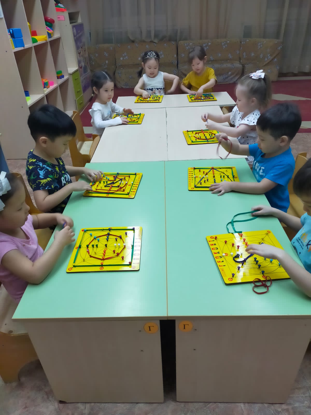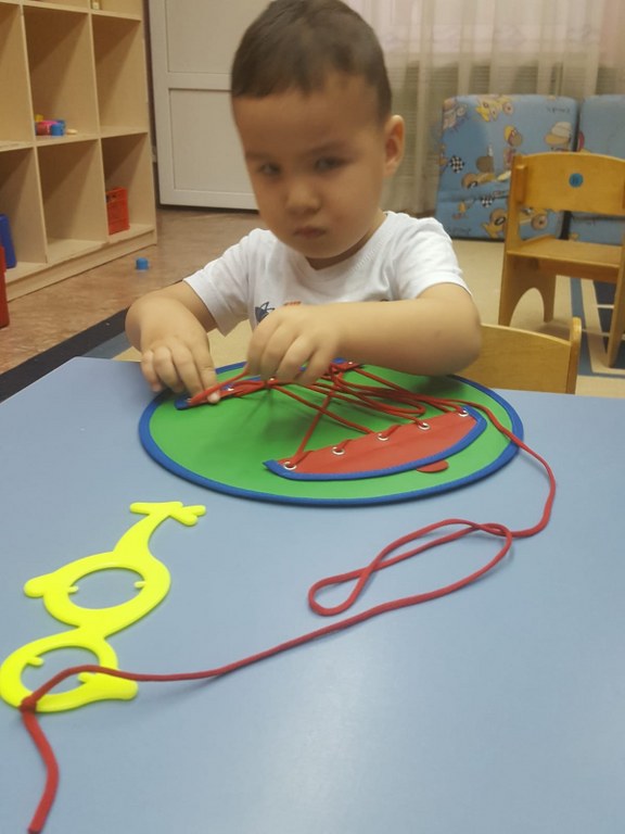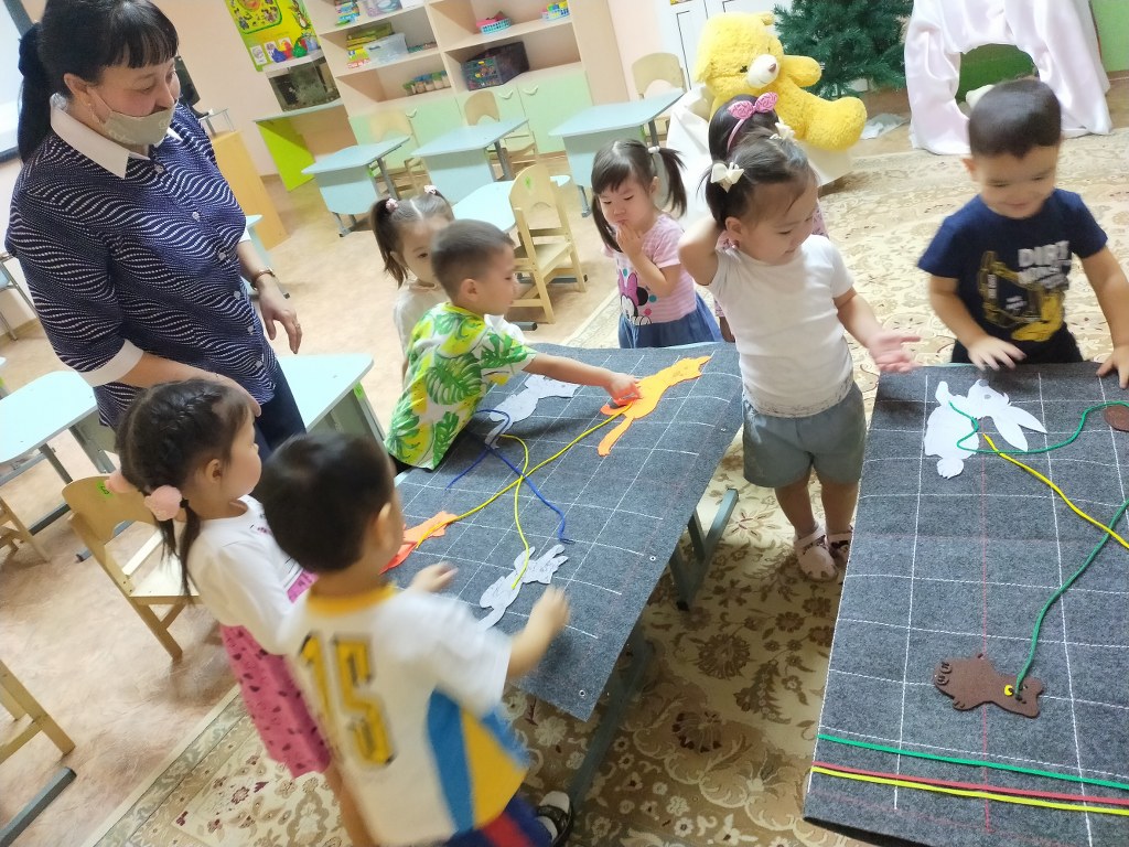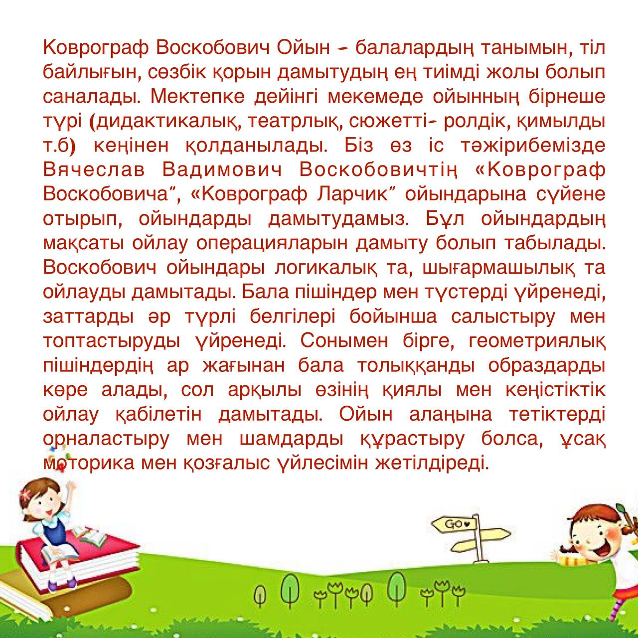 Коврограф Воскобович Ойын – балалардың танымын, тіл байлығын, сөзбік қорын дамытудың ең тиімді жолы болып саналады. Мектепке дейінгі мекемеде ойынның бірнеше түрі (дидактикалық, театрлық, сюжетті- ролдік, қимылды т.б) кеңінен қолданылады. Біз өз іс тәжірибемізде Вячеслав Вадимович Воскобовичтің «Коврограф Воскобовича”, «Коврограф Ларчик” ойындарына сүйене отырып, ойындарды дамытудамыз. Бұл ойындардың мақсаты ойлау операцияларын дамыту болып табылады. Воскобович ойындары логикалық та, шығармашылық та ойлауды дамытады. Бала пішіндер мен түстерді үйренеді, заттарды әр түрлі белгілері бойынша салыстыру мен топтастыруды үйренеді. Сонымен бірге, геометриялық пішіндердің ар жағынан бала толыққанды образдарды көре алады, сол арқылы өзінің қиялы мен кеңістіктік ойлау қабілетін дамытады. Ойын алаңына тетіктерді орналастыру мен шамдарды құрастыру болса, ұсақ моторика мен қозғалыс үйлесімін жетілдіреді.