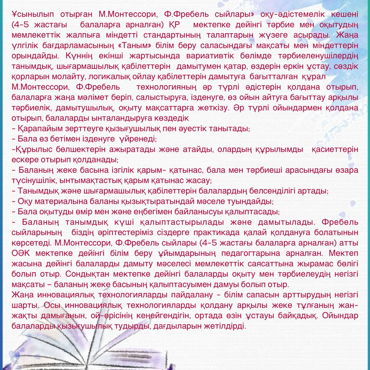 - Баланың танымдық күші қалыптастырылады және дамытылады. Фребель сыйларының біздің әріптестеріміз сіздерге практикада қалай қолдануға болатынын көрсетеді. М.Монтессори, Ф.Фребель сыйлары (4-5 жастағы балаларға арналған) атты ОӘК мектепке дейінгі білім беру ұйымдарының педагогтарына арналған. Мектеп жасына дейінгі балаларды дамыту мәселесі мемлекеттік саясаттына жырамас бөлігі болып отыр. Сондықтан мектепке дейінгі балаларды оқыту мен тәрбиелеудің негізгі мақсаты – баланың жеке басының қалыптасуымен дамуы болып отыр.