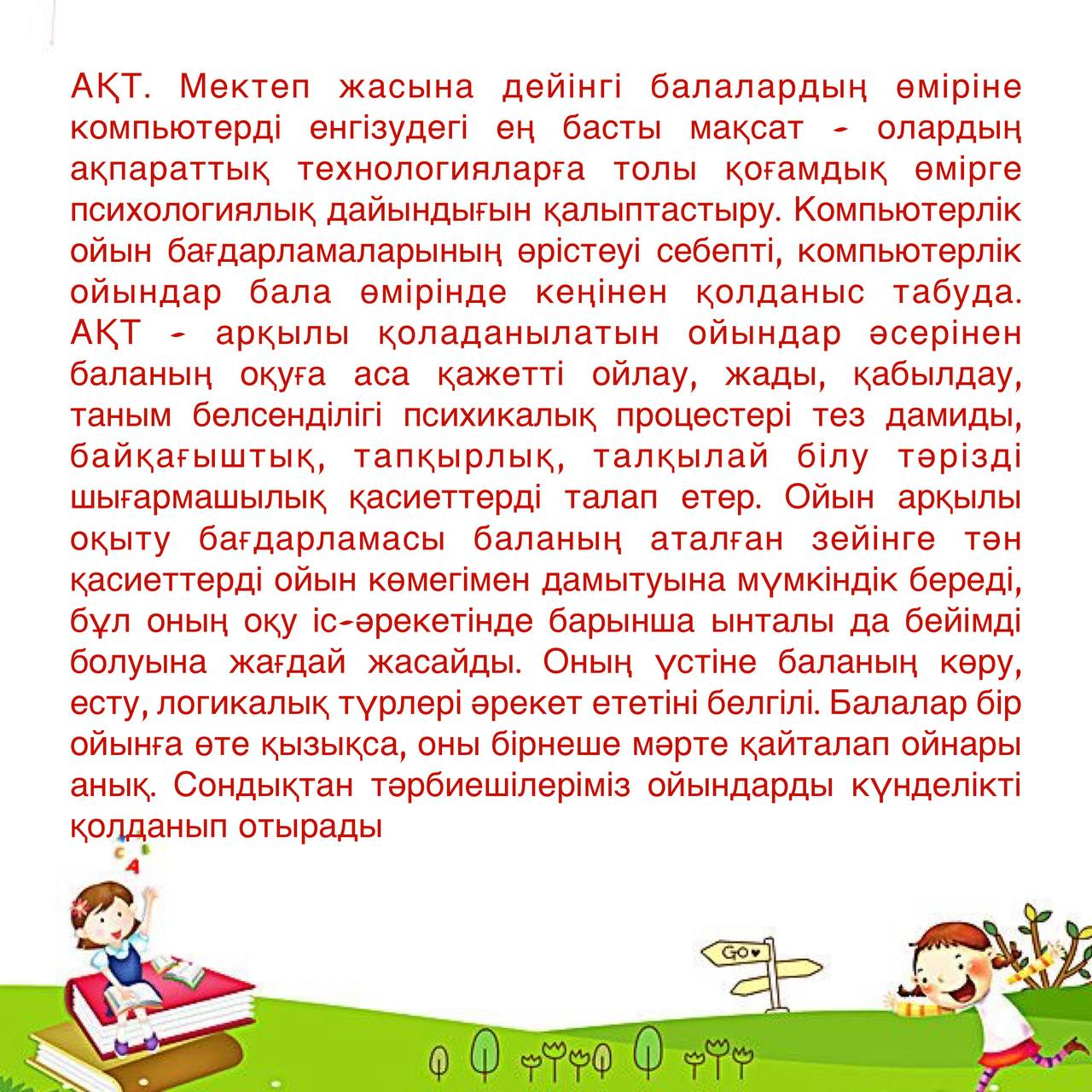 АҚТ. Мектеп жасына дейінгі балалардың өміріне компьютерді енгізудегі ең басты мақсат - олардың ақпараттық технологияларға толы қоғамдық өмірге психологиялық дайындығын қалыптастыру. Компьютерлік ойын бағдарламаларының өрістеуі себепті, компьютерлік ойындар бала өмірінде кеңінен қолданыс табуда. АҚТ - арқылы қоладанылатын ойындар әсерінен баланың оқуға аса қажетті ойлау, жады, қабылдау, таным белсенділігі психикалық процестері тез дамиды, байқағыштық, тапқырлық, талқылай білу тәрізді шығармашылық қасиеттерді талап етер. Ойын арқылы оқыту бағдарламасы баланың аталған зейінге тән қасиеттерді ойын көмегімен дамытуына мүмкіндік береді, бұл оның оқу іс-әрекетінде барынша ынталы да бейімді болуына жағдай жасайды. Оның үстіне баланың көру, есту, логикалық түрлері әрекет ететіні белгілі. Балалар бір ойынға өте қызықса, оны бірнеше мәрте қайталап ойнары анық. Сондықтан тәрбиешілеріміз ойындарды күнделікті қолданып отырады
