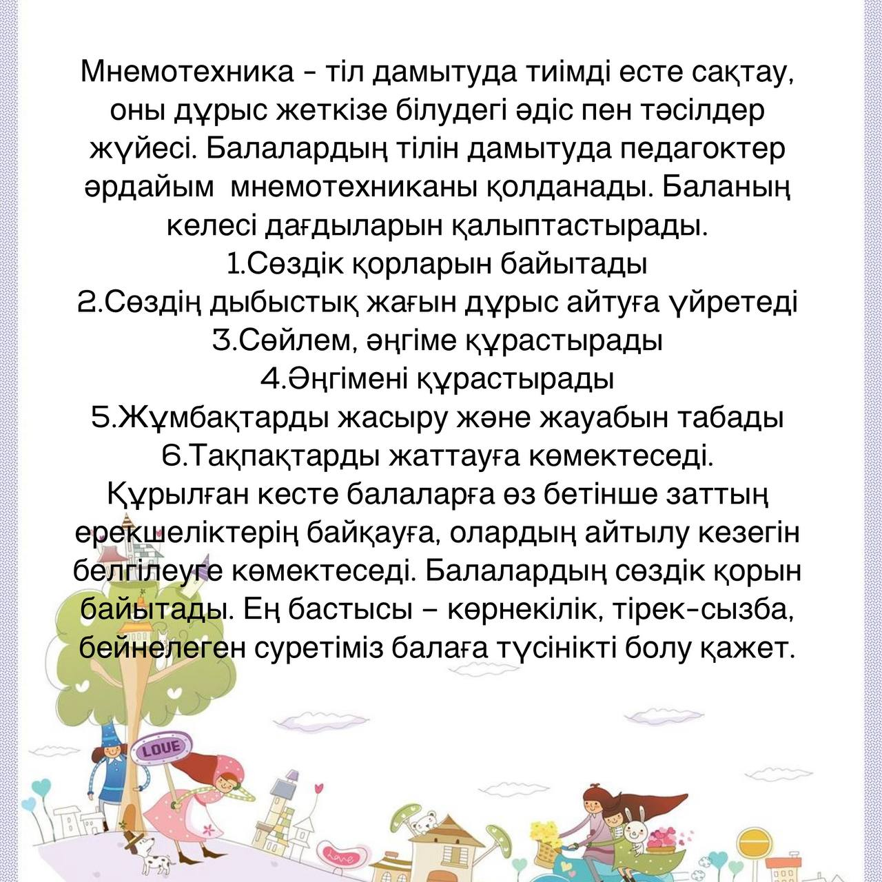 Мнемотехника - тіл дамытуда тиімді есте сақтау, оны дұрыс жеткізе білудегі әдіс пен тәсілдер жүйесі. Балалардың тілін дамытуда педагоктер әрдайым мнемотехниканы қолданады. Баланың келесі дағдыларын қалыптастырады.