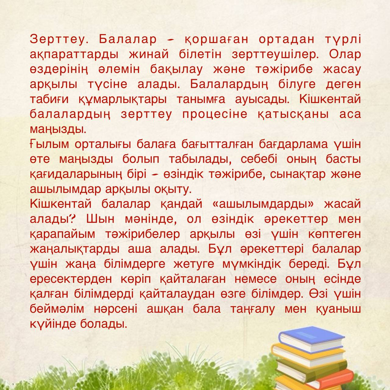 Зерттеу Балалар – қоршаған ортадан түрлі ақпараттарды жинай білетін зерттеушілер. Олар өздерінің әлемін бақылау және тәжірибе жасау арқылы түсіне алады. Балалардың білуге деген табиғи құмарлықтары танымға ауысады. Кішкентай балалардың зерттеу процесіне қатысқаны аса маңызды.