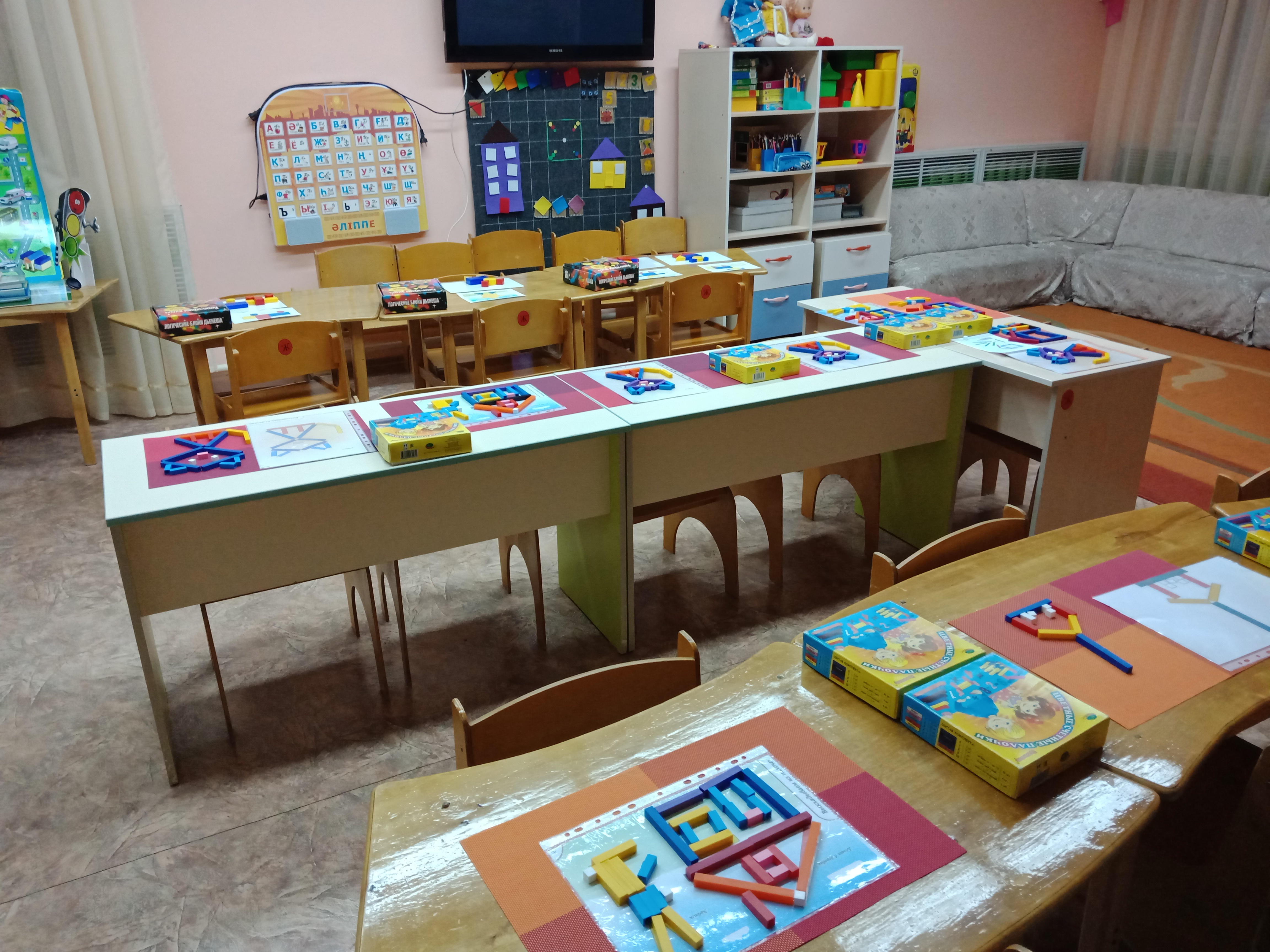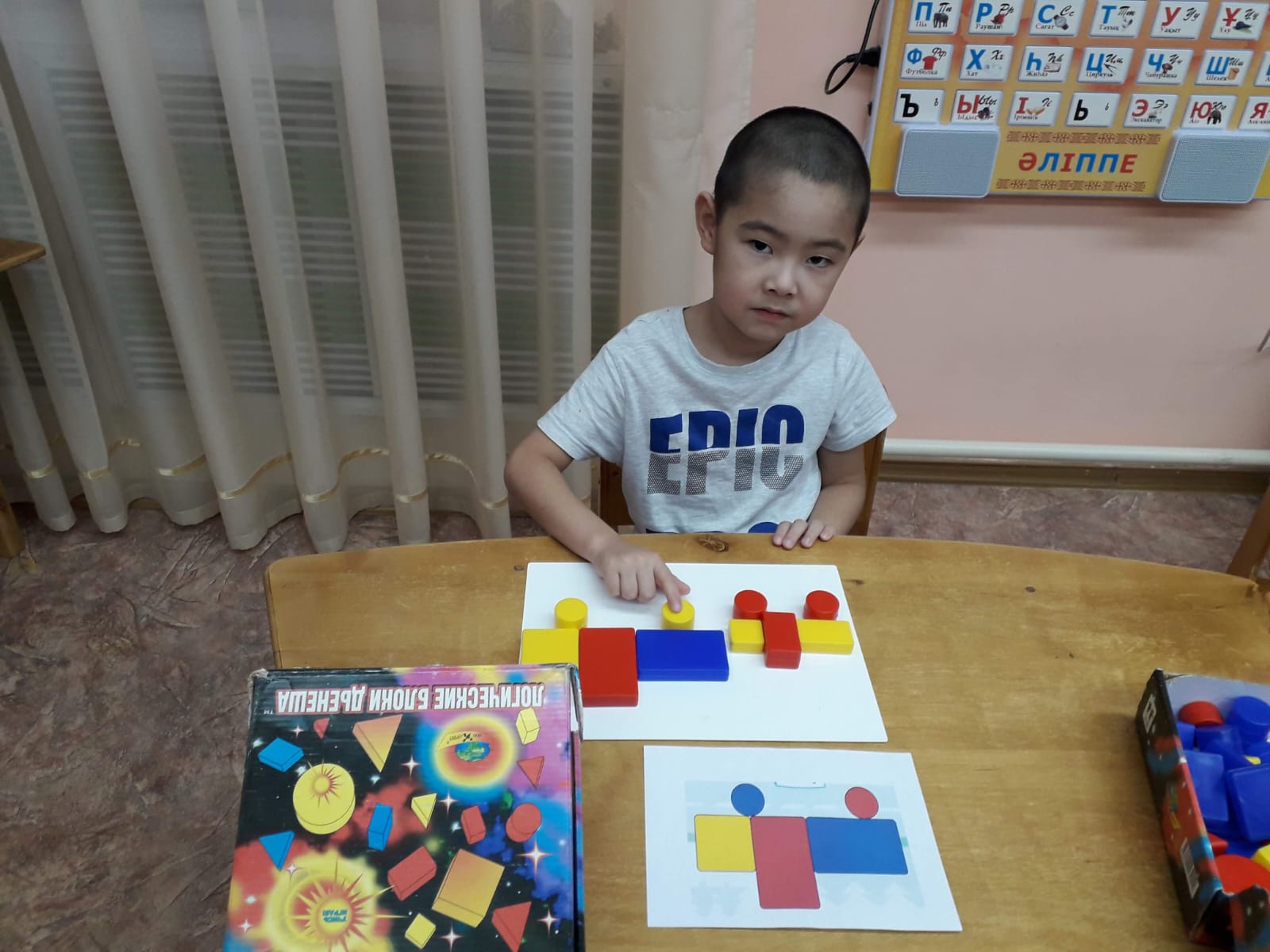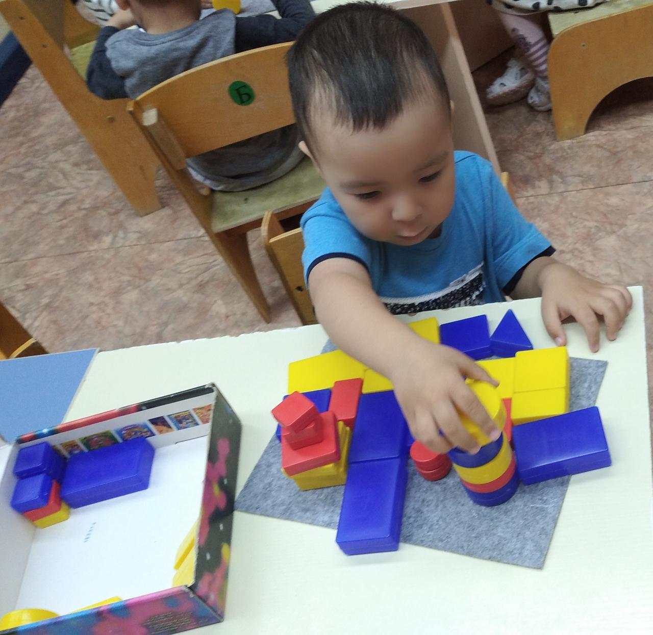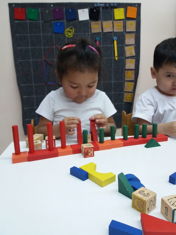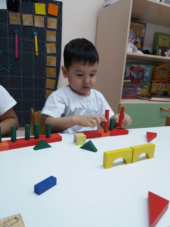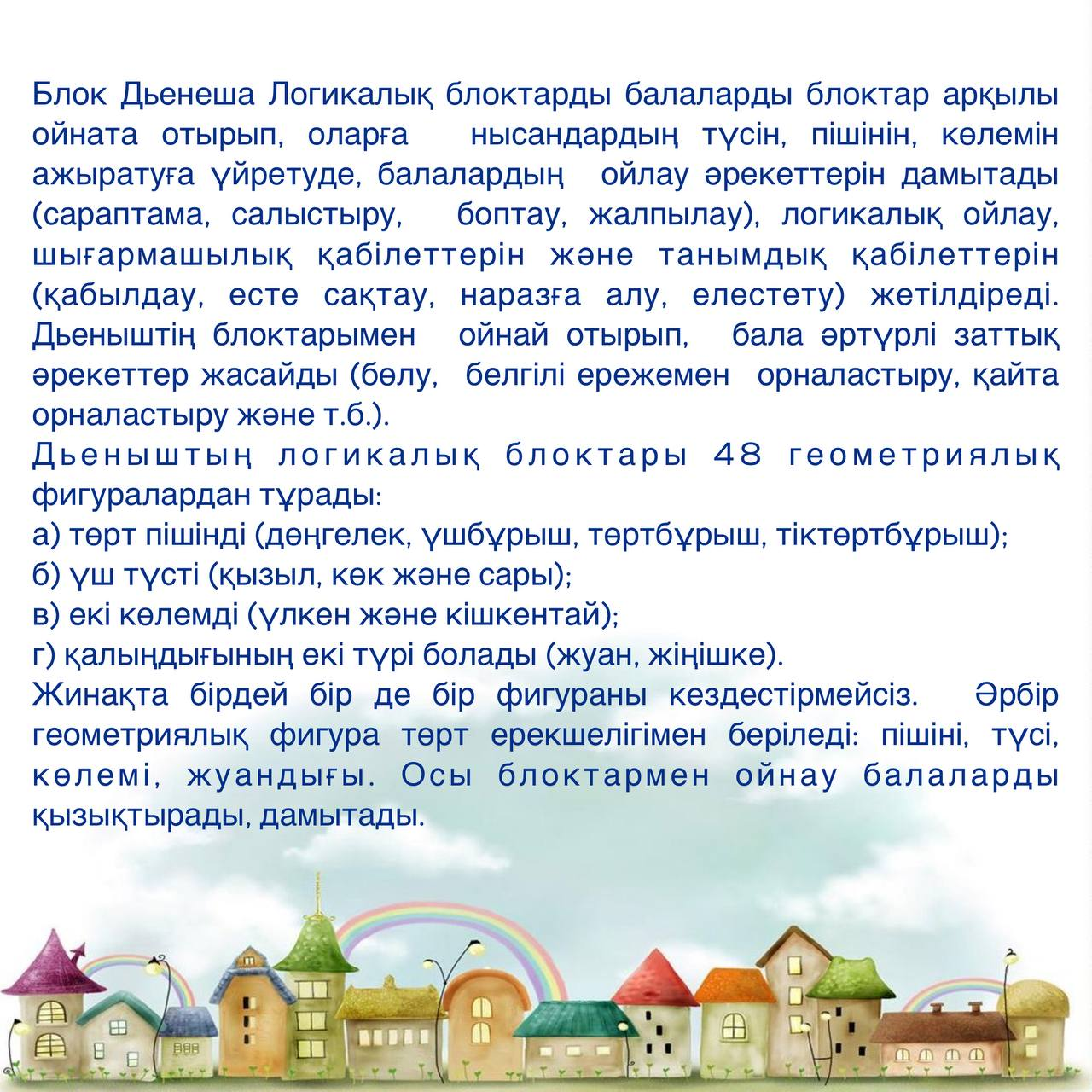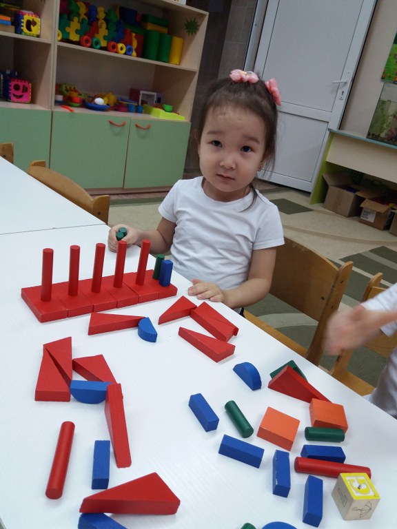 Блок Дьенеша Логикалық блоктарды балаларды блоктар арқылы ойната отырып, оларға нысандардың түсін, пішінін, көлемін ажыратуға үйретуде, балалардың ойлау әрекеттерін дамытады (сараптама, салыстыру, боптау, жалпылау), логикалық ойлау, шығармашылық қабілеттерін және танымдық қабілеттерін (қабылдау, есте сақтау, наразға алу, елестету) жетілдіреді. Дьеныштің блоктарымен ойнай отырып, бала әртүрлі заттық әрекеттер жасайды (бөлу, белгілі ережемен орналастыру, қайта орналастыру және т.б.).